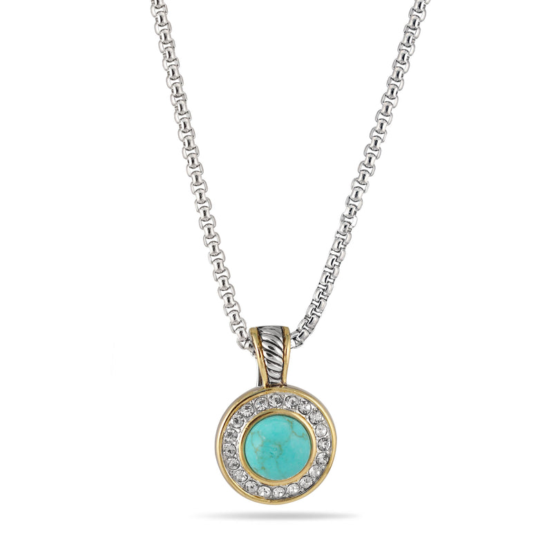 TWO TONE TURQUOISE AND CRYSTAL ROUND PENDANT NECKLACE 62994EH-TQ