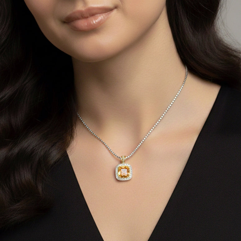 TWO TONE SQUARE CHAMPAGNE CRYSTAL AND RHINESTONES ENGRAVED PENDAN T BOX CHAIN NECKLACE # 93099EH-CH