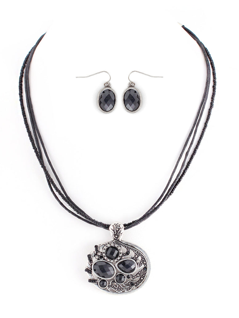 Fabulous Design Jet Stone With Silver Oval Shape Pendant With Waxed Cotton Cord Necklace And Earrings Set