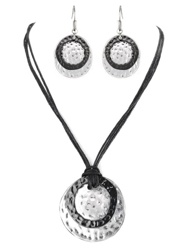 Hematite And Silver Hammered Round Pendant With Cotton Cord Necklace And Earrings Set