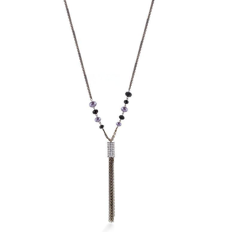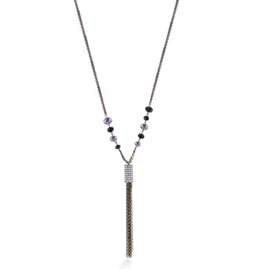 Black And Gold-Tone Metal Chain Amethyst Black Bead White Crystal Tassel Necklace