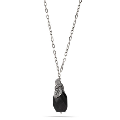 Antique Silver-Tone Metal Black Faceted Stone Pendant Long Neckalace