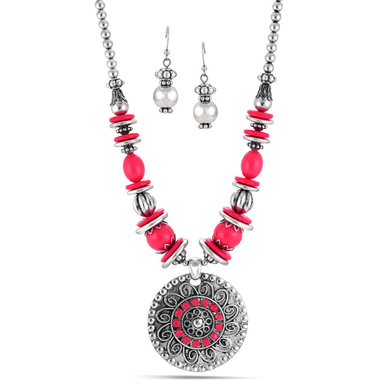 Antique Silver-Tone Metal Earrings And Pink Necklace