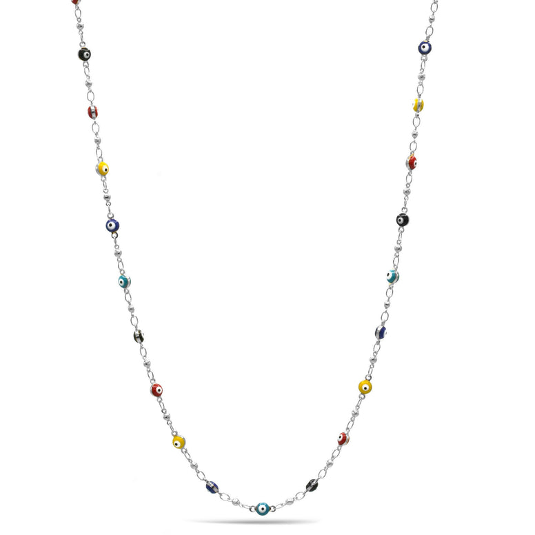 Expertly crafted, this Rhodium Multi Color Evil Eye Choker Necklace is a must-have accessory. With its protective evil eye design and colorful accents, it adds a touch of style and good luck to any outfit. Made with high-quality materials, it's both durable and fashionable.