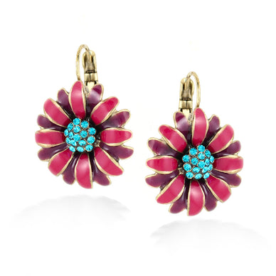 Gold-Tone Metal Blue Crystal Pink Enamel Flower Earrings