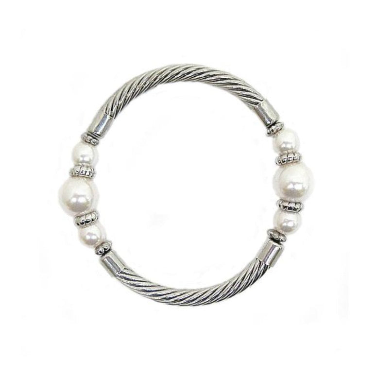 This Bracelet Looks So Rich And Elegant. Three Cream Glass Pearls On Each Side, Perfectly Symmetrical. Pearl Bead In The Middle Is Slightly Bigger Than Other Two Beads And Connected To Curved Cable Pipe With Elastic Bands. Matching Necklace And Earrings Are Also Available.