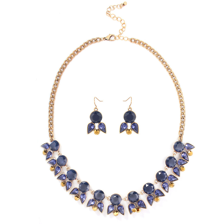 Gold Tone Metal Blue Stone With Blue Crystal Necklace Earring Set