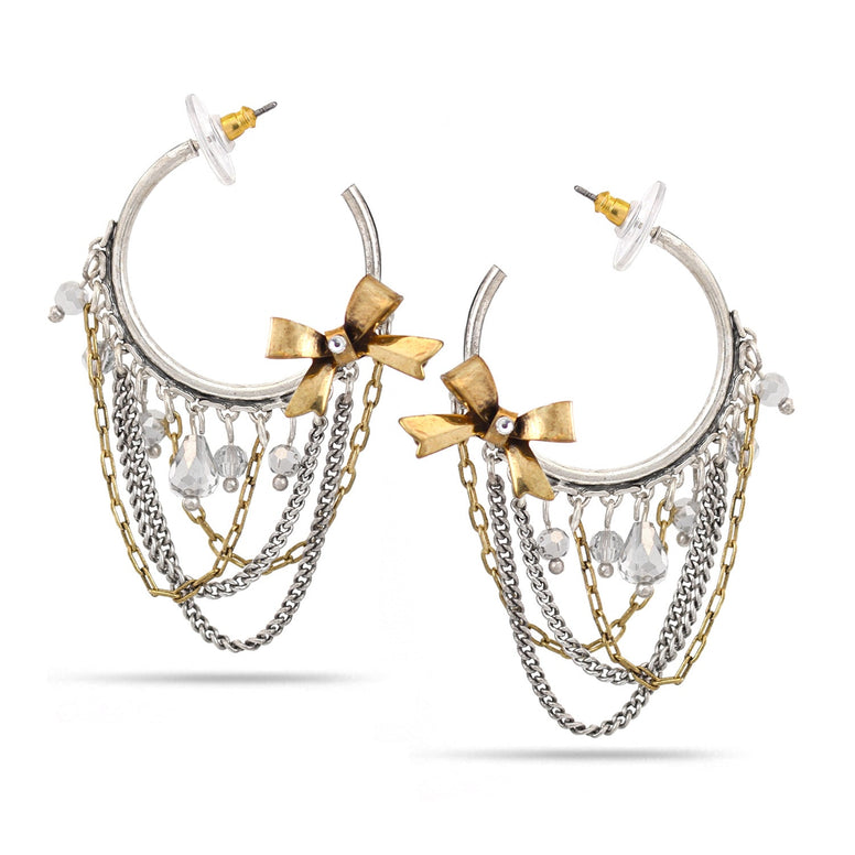 Silver And Gold-Tone Metal Bow Crystal Stud Earrings