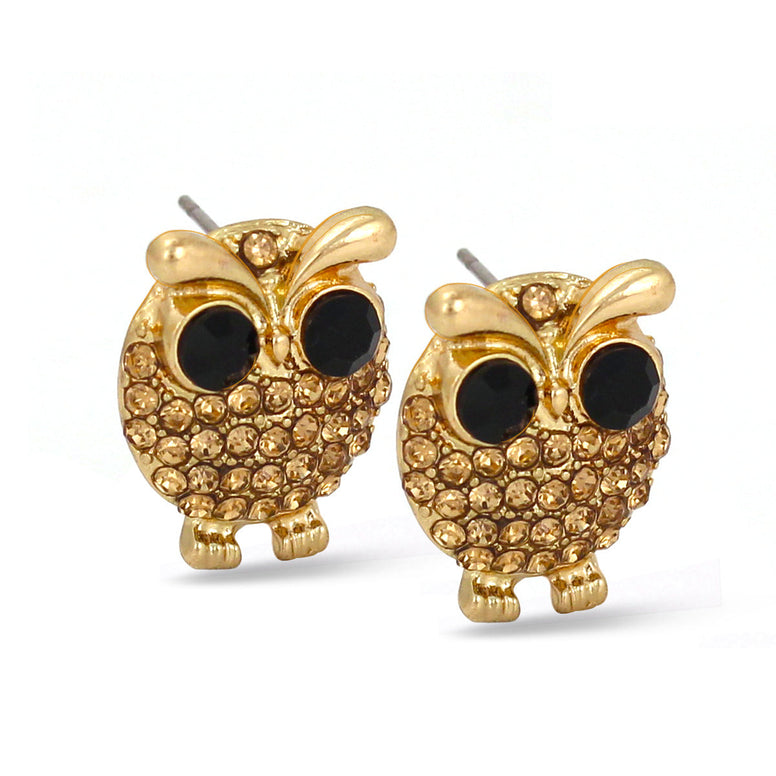 Gold-Tone Metal Black And White Crystal Owl Stud Earrings
