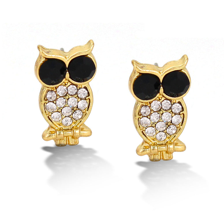 Gold-Tone Metal Black And White Crystal Owl Stud Earrings