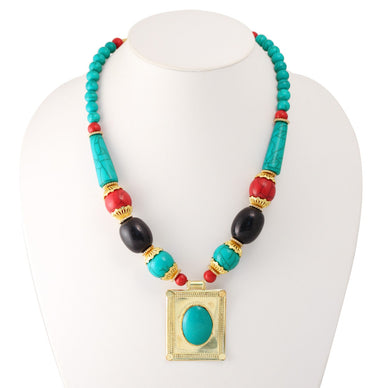 Gold Black Coral And Turquoise Beads Rectangle Pendant Adjustable Length Necklace