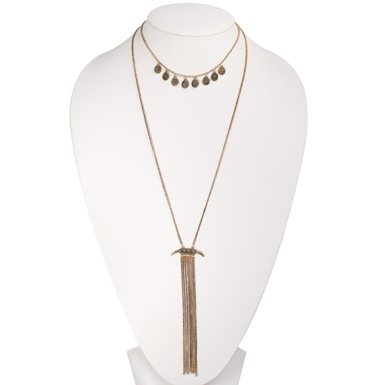 Gold-Tone Metal Coins Adjustable Lobster Claw Closure Tassel Two Layer Necklace