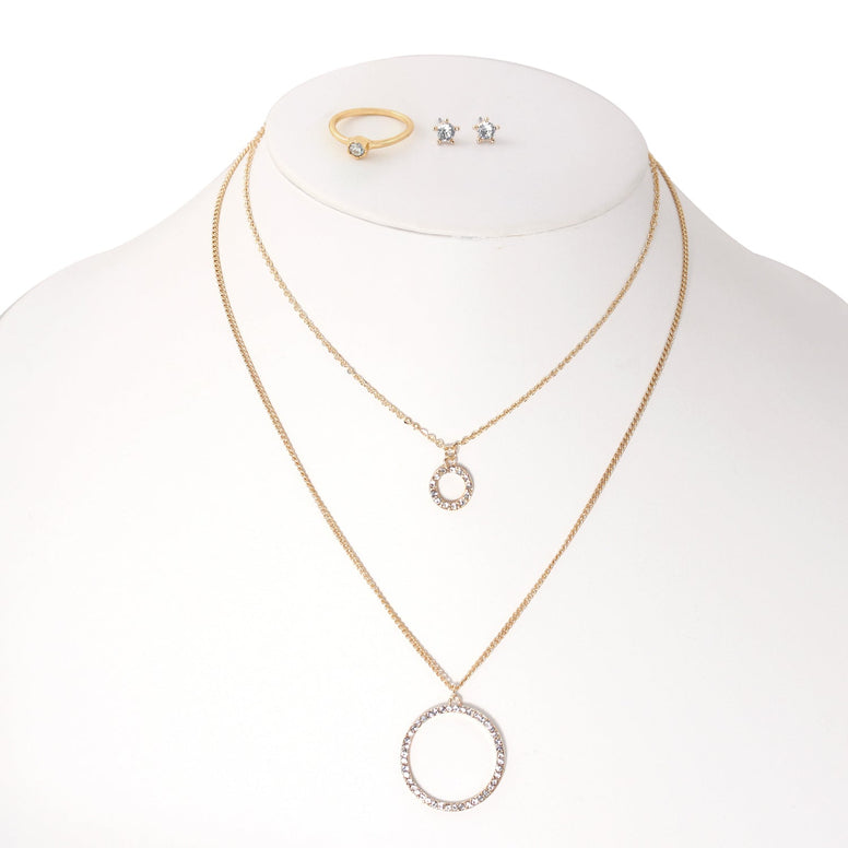 Gold-Tone Metal Crystal Rings And Earrings Adjustable Lobster Claw Closure Necklaces Set