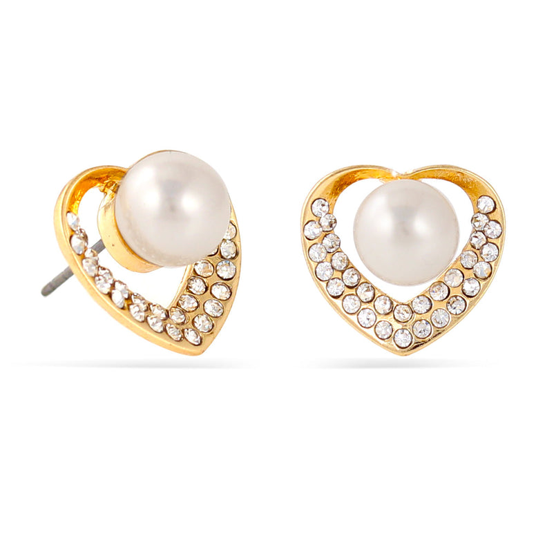 These elegant gold stud earrings feature a heart shaped 8mm Faux pearl and sparkling crystal accents. Perfect for adding a touch of sophistication to any outfit. Expertly crafted and versatile for both casual and formal occasions.