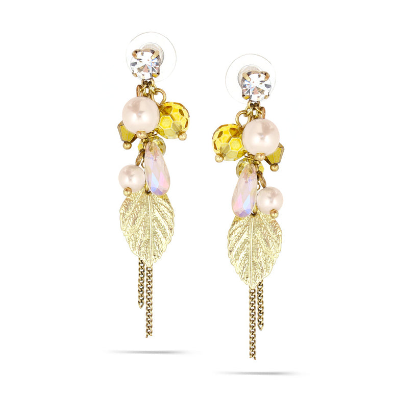 Gold-Tone Metal Leaf Pearl Crystal Charm Earrings