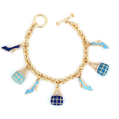 Gold-Tone Metal Turquoise And Navy Blue Bags And Shoe Crystal Charms Bracelets