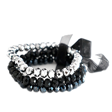 Jet Silver Mixed Glass Crystal With Black Bow Stretch Bracelet Set Of 3Pcs