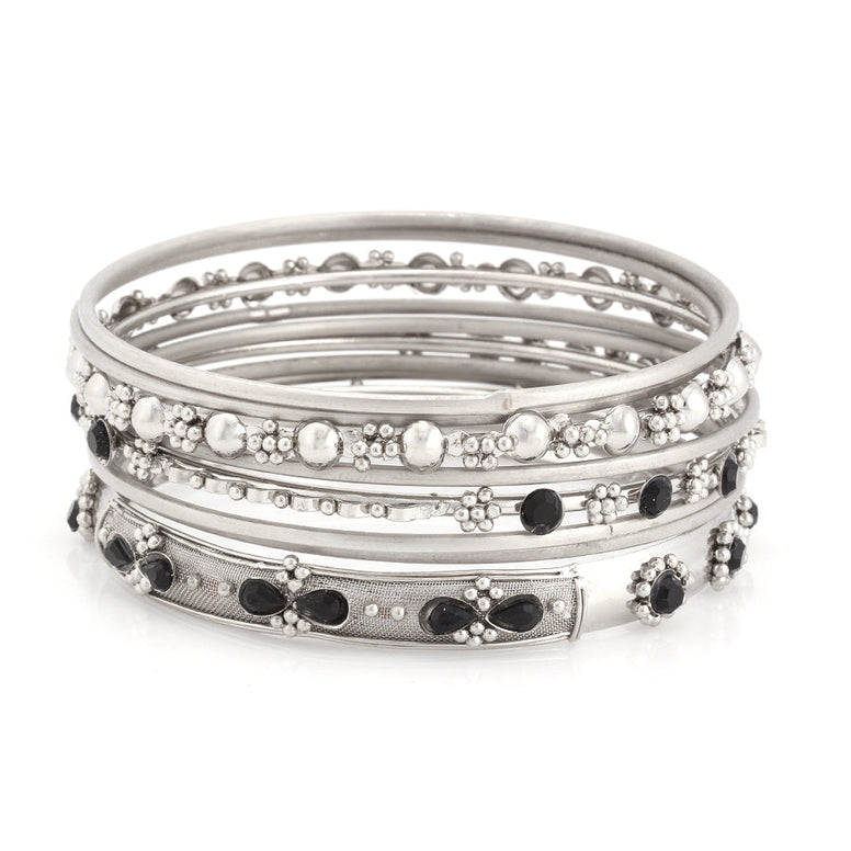 Kb2224445 Sol/Blk Silver-Tone Black Set Of 9 Bangles