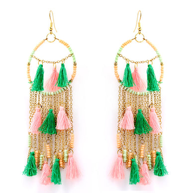 Gold Tone Metal Pink And Green Beads Tassel Earring
