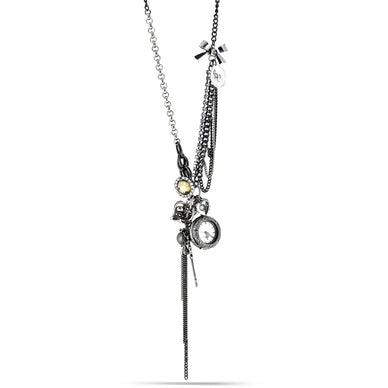 Rhodium-Tone Metal Clock And Mix Charm Tassel Necklace