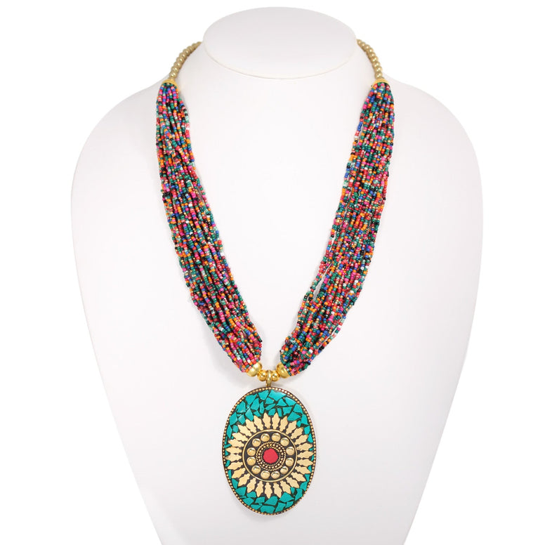 Gold-Tone Metal Turquiuse Pendant Multicolored Seed Beads Adjustable Lobster Claw Closure Layered Necklaces
