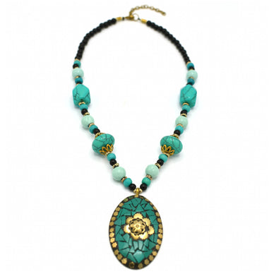 TURQUOISE AND BLACK BEADS WITH GOLD OVAL PENDANT NECKLACE# FWNK-2109-82