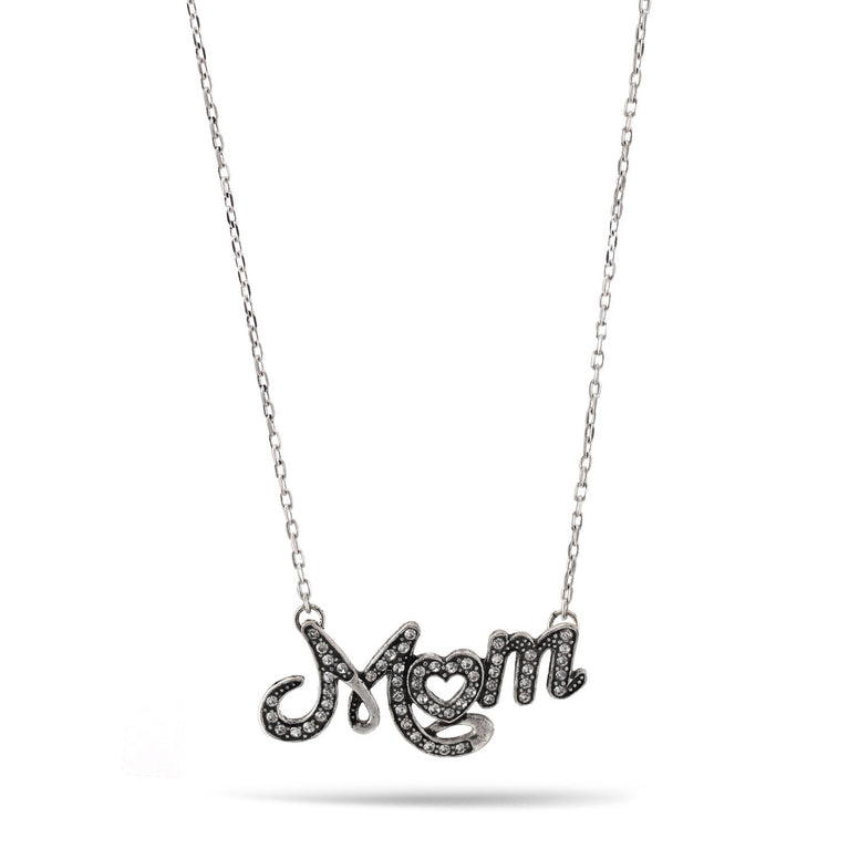 Oxidized Silver Mom Crystal Pendant Adjustable Length Chain Necklace