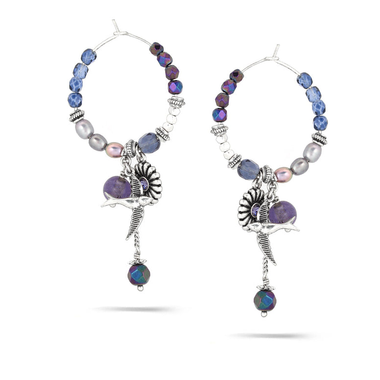 Silver-Tone Metal Pearl And Crystal Charm Hoop Earrings