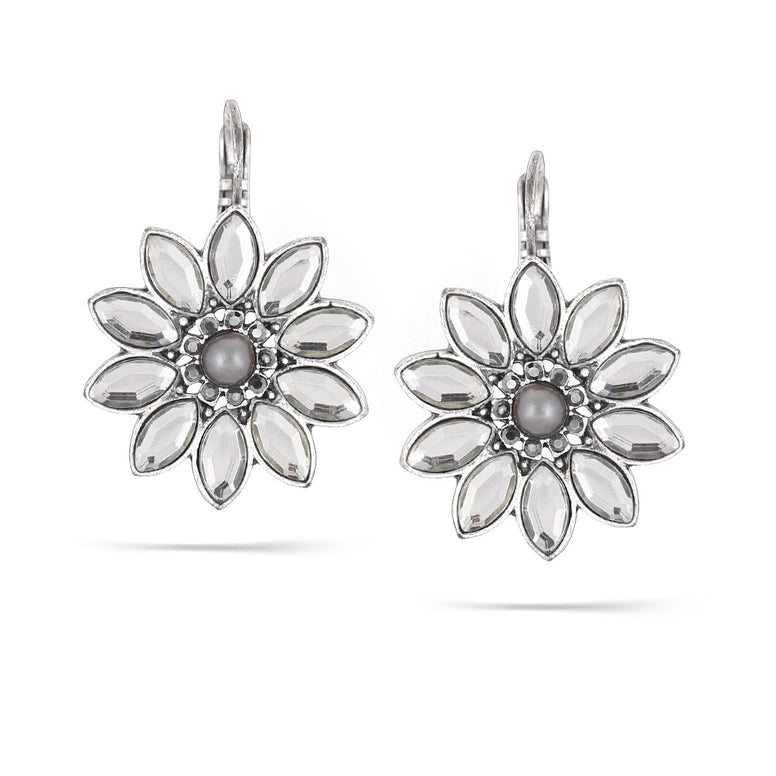 Silver-Tone Metal White Crystal And Grey Pearl Flower Earrings