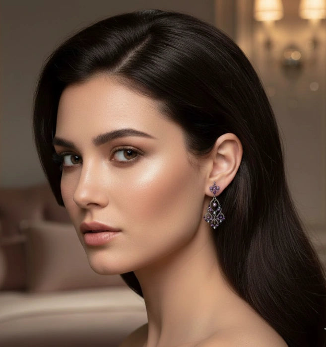 A Fresh Take On The Chandelier. Amethyst Color Rhinestones Boldly Anchors This Have-To-Have Style. Set In Hematite Finish With Disc Clutch Closure.