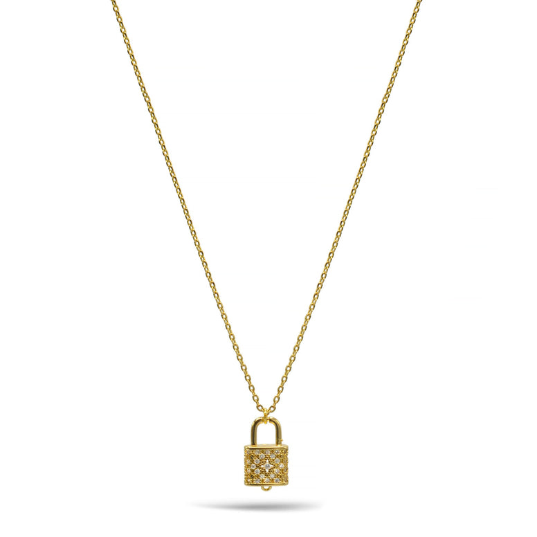 This sophisticated necklace features an alluring gold lock crafted from gold-plated metal and a shimmering crystal charm for a timeless, classic look. The unique gold lock design offers an elegant, eye-catching accent. A luxurious addition to any wardrobe.