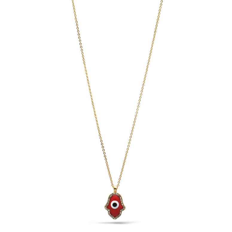 GOLD RED HAMSA HAND PENDANT SHORT NECKLACE # HNN90662GD