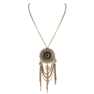 Delicate Flower With Rhinestone Gold Tassel Long Necklace