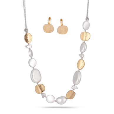 This stunning set features two-toned silver and gold hammered earrings and necklace, adding a touch of elegance to any outfit. The unique hammered design adds texture and dimension, making this set a beautiful addition to any jewelry collection. Perfect for both casual and formal occasions.