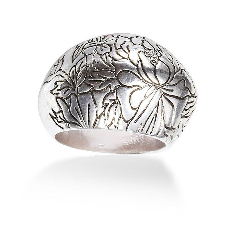 Silver-Tone Metal Flower Carving Size 7 Ring