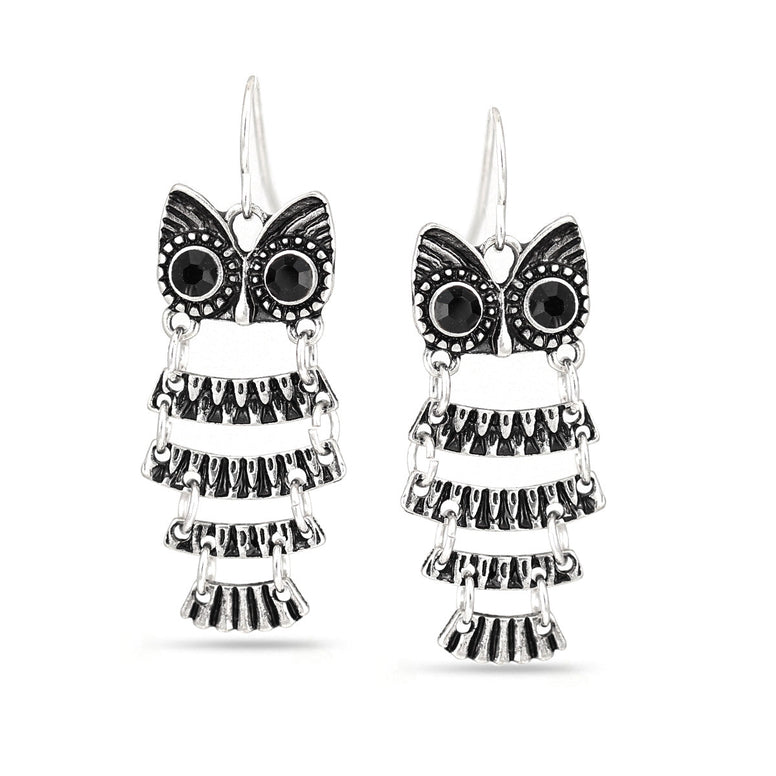 Silver-Tone Metal Black Crystal Owl Drop Earrings