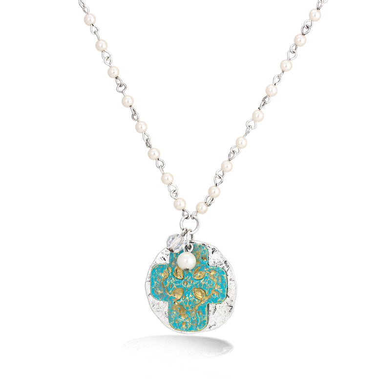 Silver-Tone Metal White Pearl Turquoise Cross Pendant Necklace