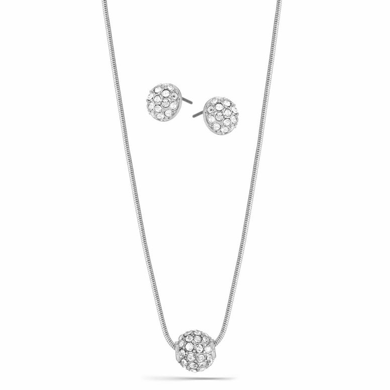 This elegant Silver Pave Crystal Ball Pendant Necklace And Earrings Set adds a touch of luxury to any outfit. The stunning pave crystal ball design exudes sophistication and the Silver color adds a warm and feminine touch. Elevate your style with this gorgeous set.