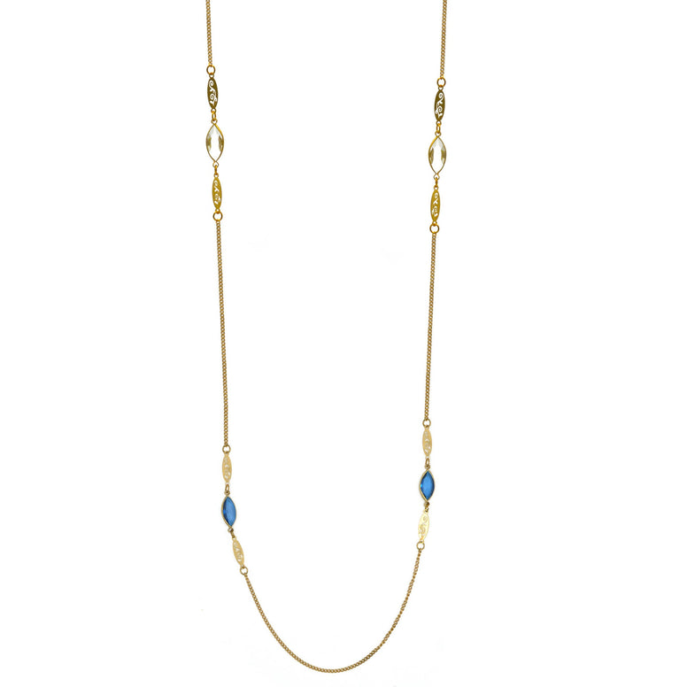 GOLD BLUE AND CLEAR MARQUES CRYSTAL LONG CHAIN NECKLACE