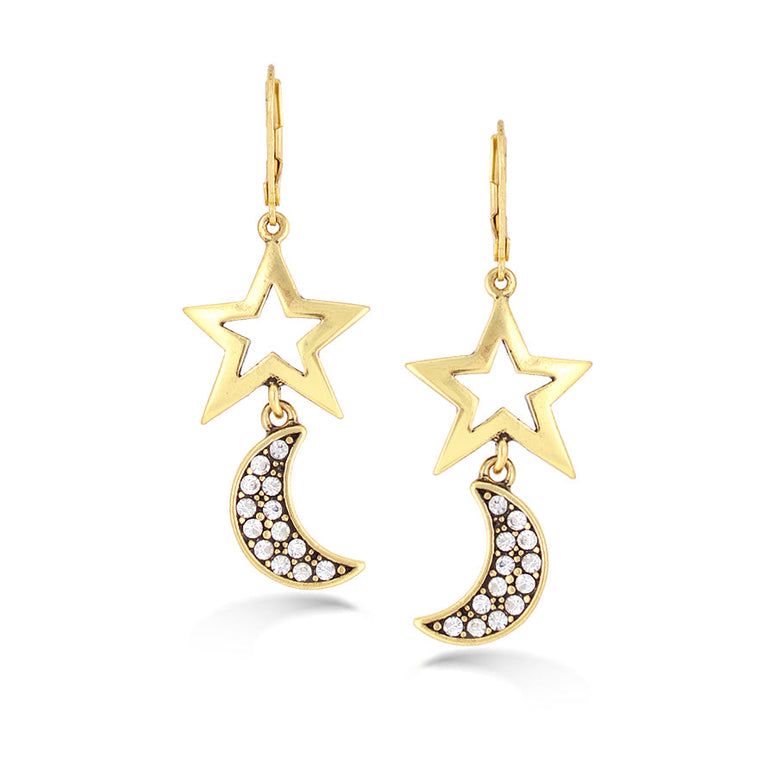 Gold-Tone Metal Star And Moon White Crystal Earrings