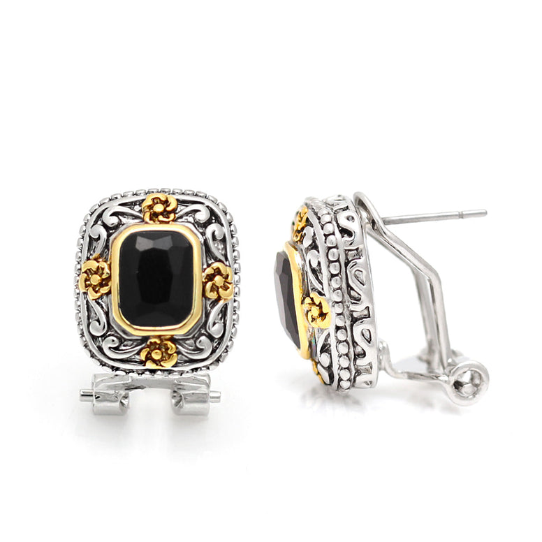 Premium Quality Two Tone Square Filigree Black Crystal Post Earrings
