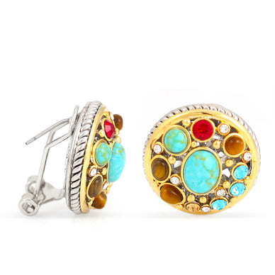 Gold And Silver-Tone Metal Turquoise Tiger'S Eye Crystal Round Stud Earrings
